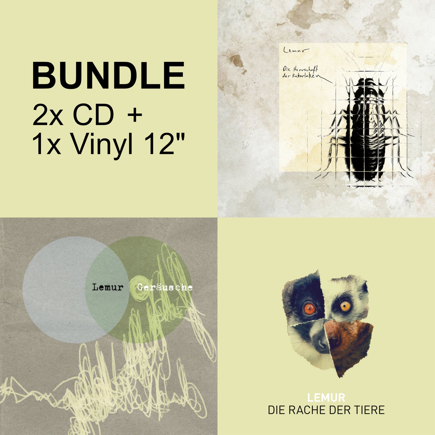 Die "Herrschaft der Kakerlaken" Vinyl 12" , die "Rache der Tiere" CD & die "Geräusche" CD.